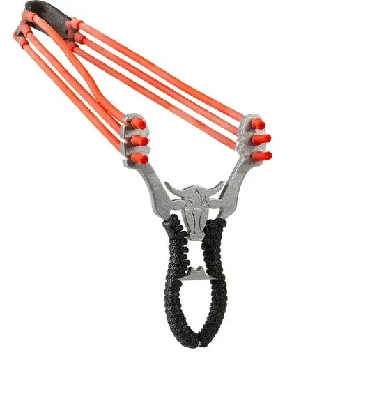 Confeccionada em metal, equipada com sistema de elásticos triplos em borracha que proporcionam maior potência e estabilidade no arremesso. Possui empunhadura reforçada e design robusto.